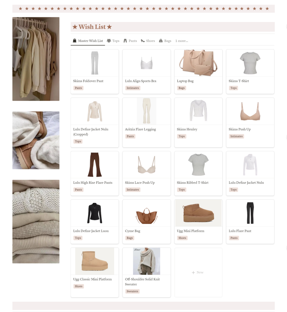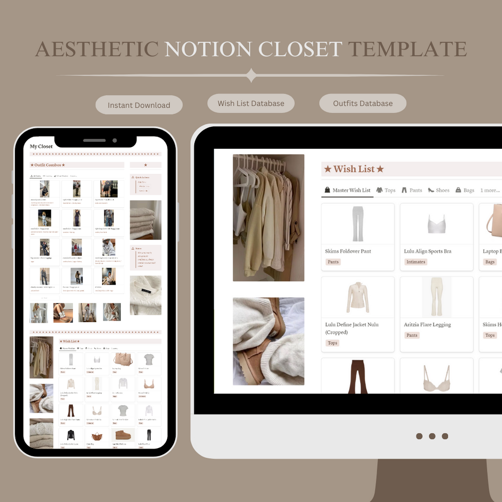 Keep track of your closet with this simple and easy to use template! Digitize your entire wardrobe so you never lose track of clothes again! This template allows you to input your own outfits or use the included suggestions! Sort your outfits based on weather conditions or occasion! The outfit database is sorted into separate views for cold to hot weather for convenient browsing. Wish list database includes views for each item category; tops, pants, shoes, bags, and intimates. Template is fully customizable!